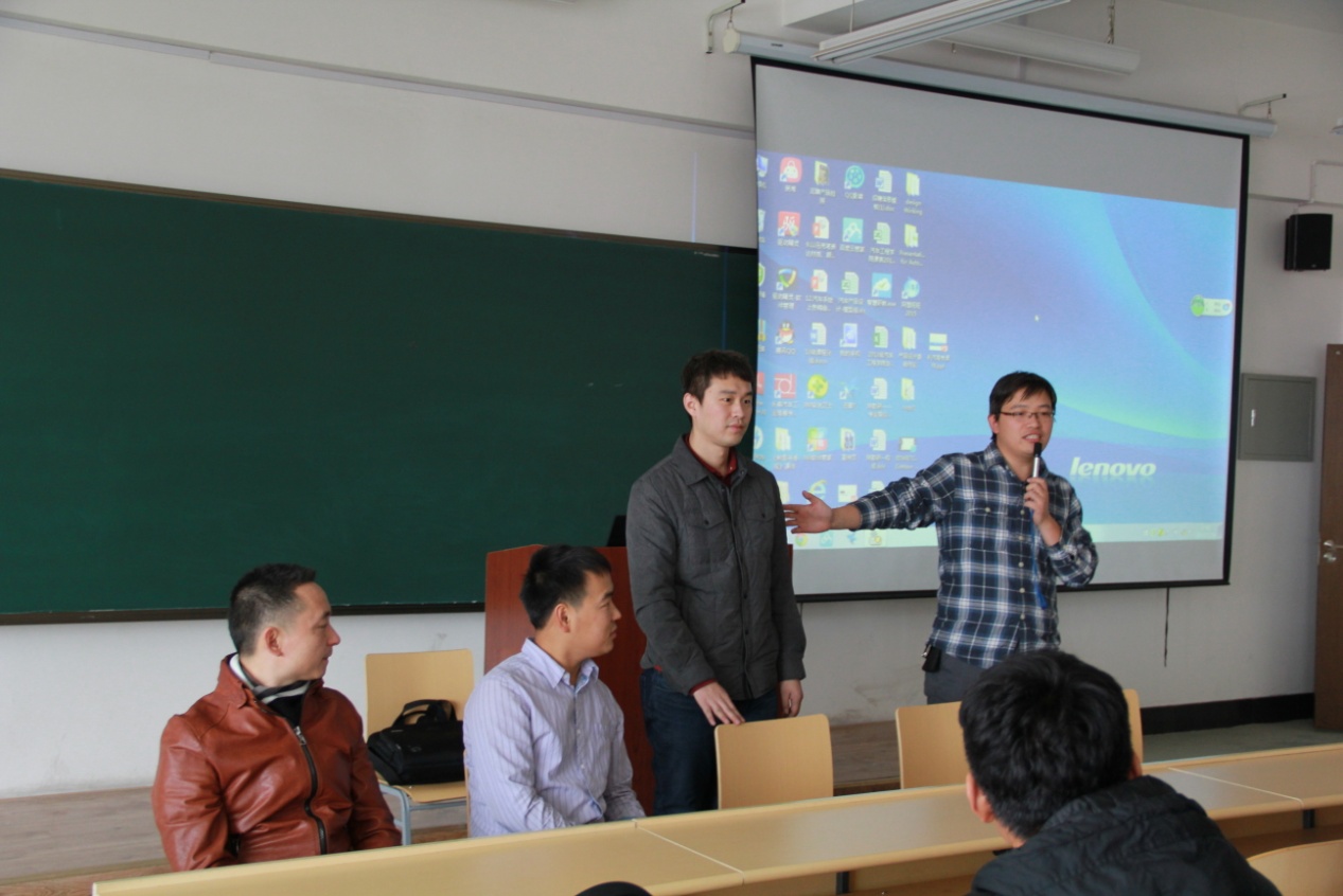 汽造专业负责人郑涛老师介绍到场优秀毕业生(从右往左依次为张超、胡聪、刘涛)