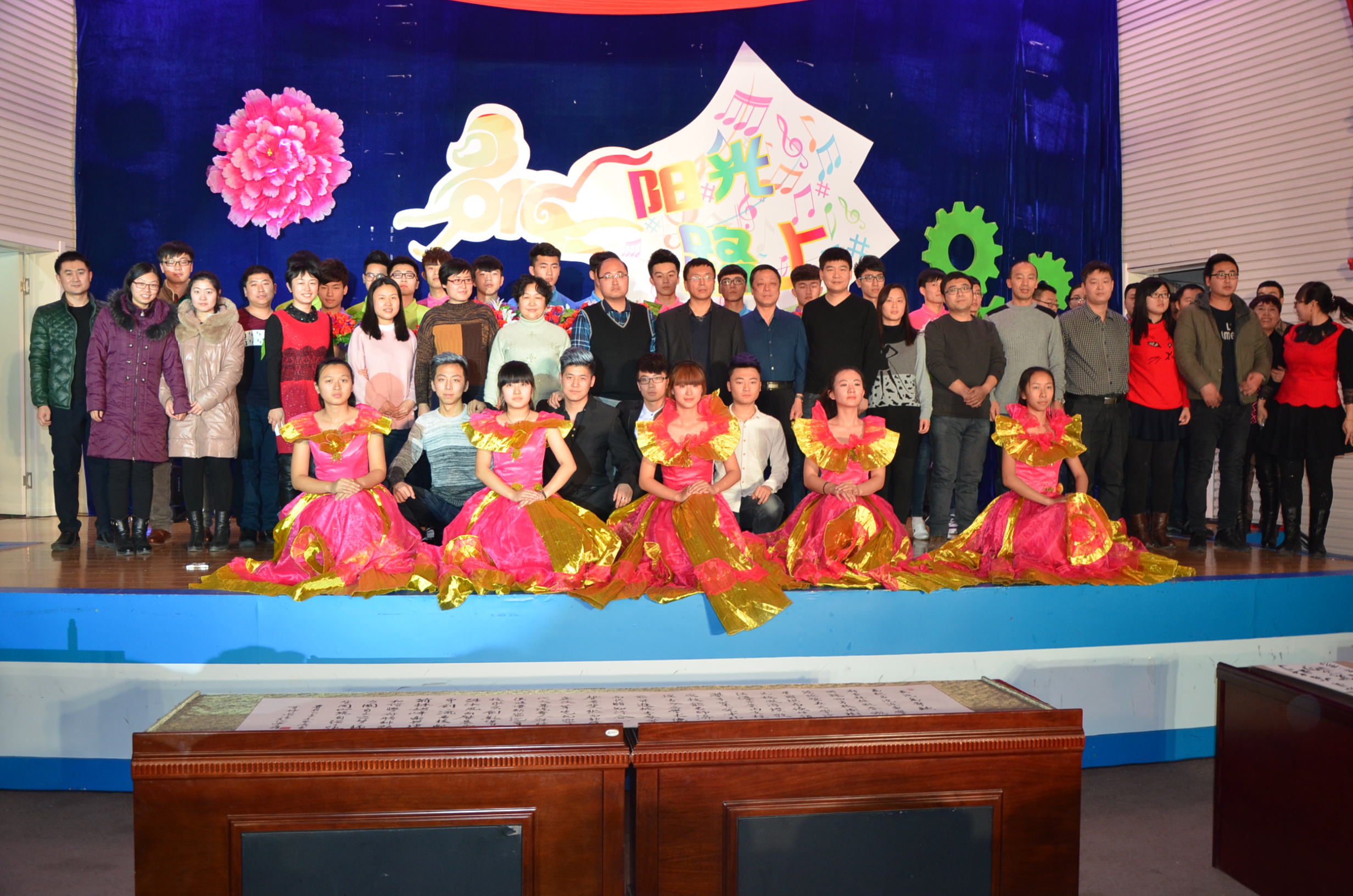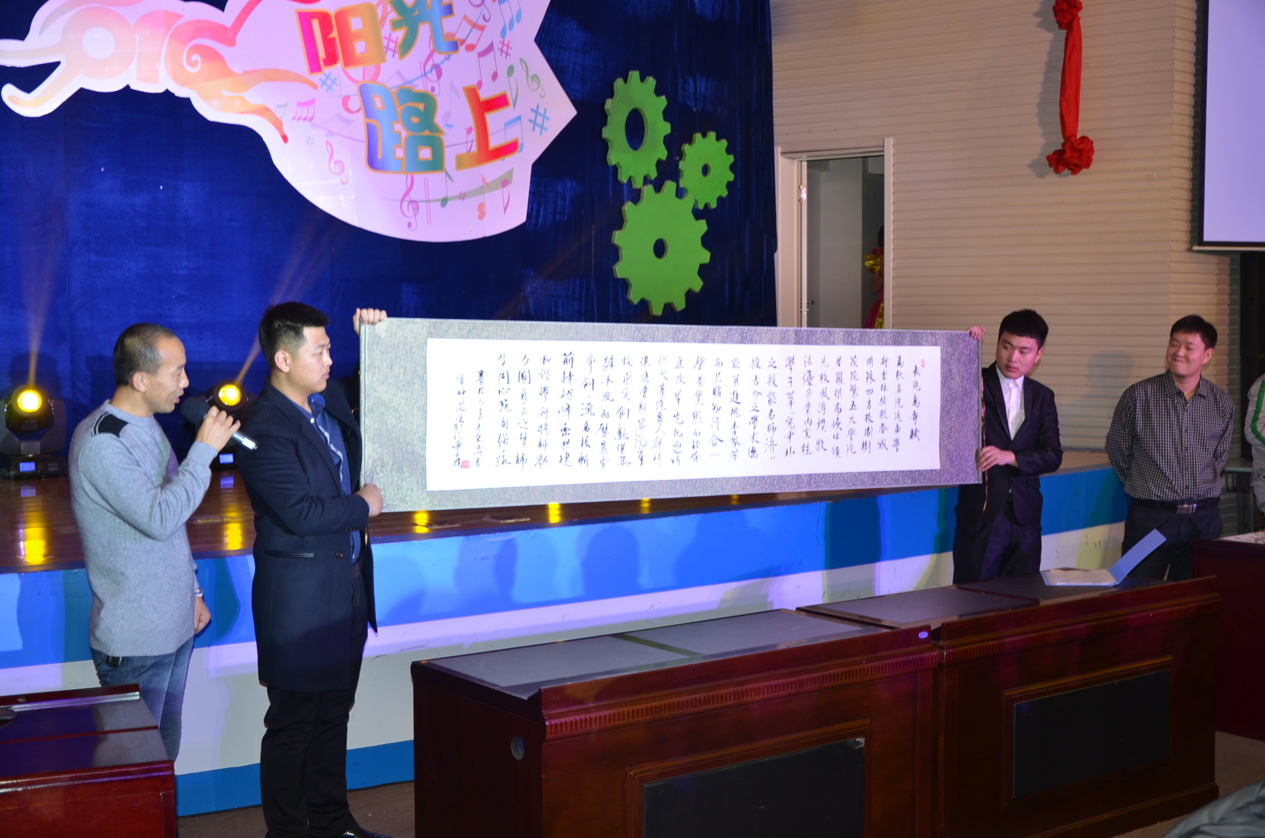 大会的最后,由学院教师王有坤老师创作、赵宏涛老师现场书写、15级学生朗诵的《汽专赋》,把大会气氛推向最高潮。《汽专赋》现场书写、朗诵这个环节也展现了学院一年来文化建设的成果,学院在过去的一年中在坚持做好专业建设的同时,对文化建设、文化育人工作也常抓不懈,终于收获了全国雪雕大赛获奖作品《托举未来》、师生一致赞美的《汽专赋》这样的累累硕果。