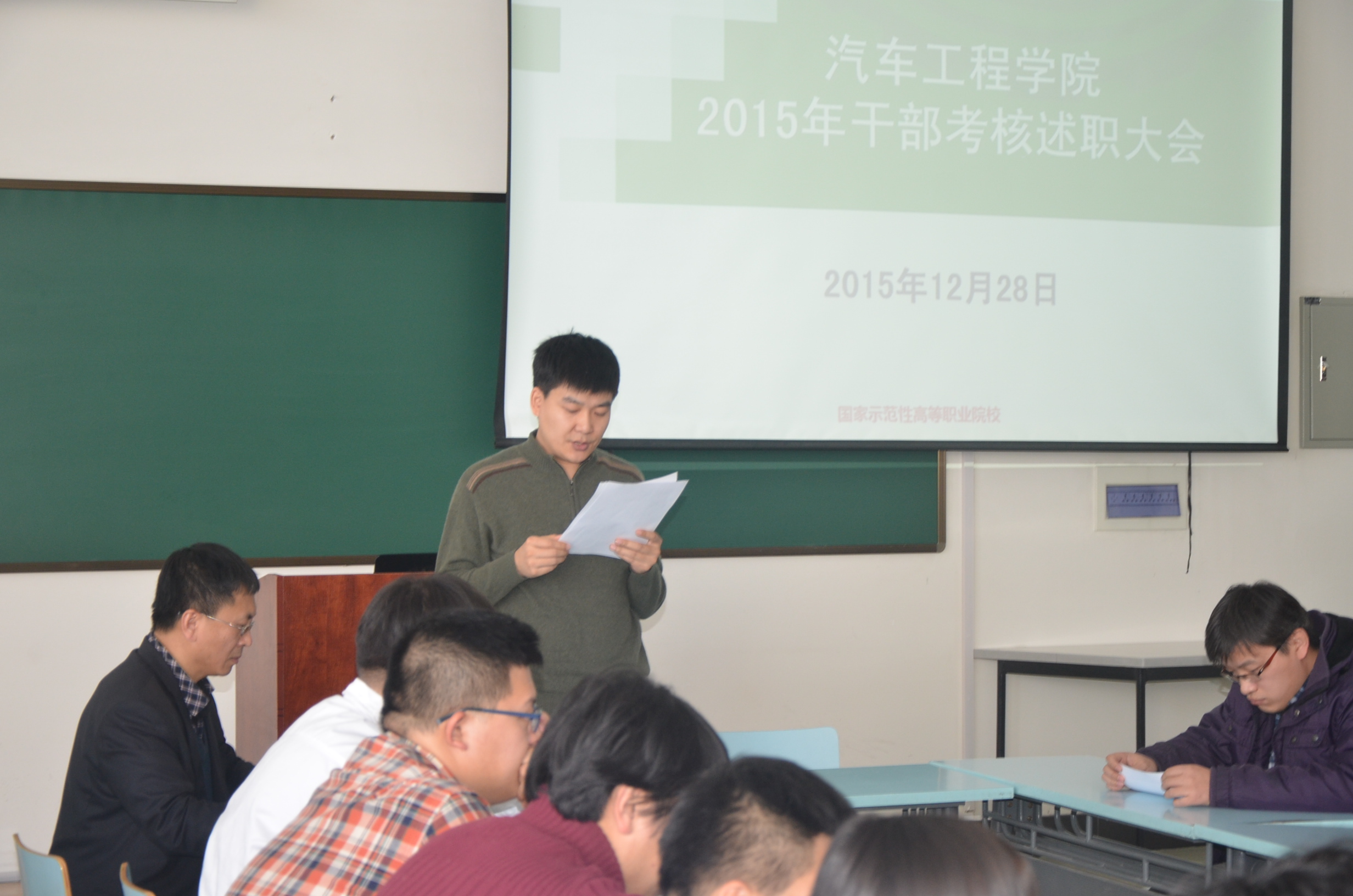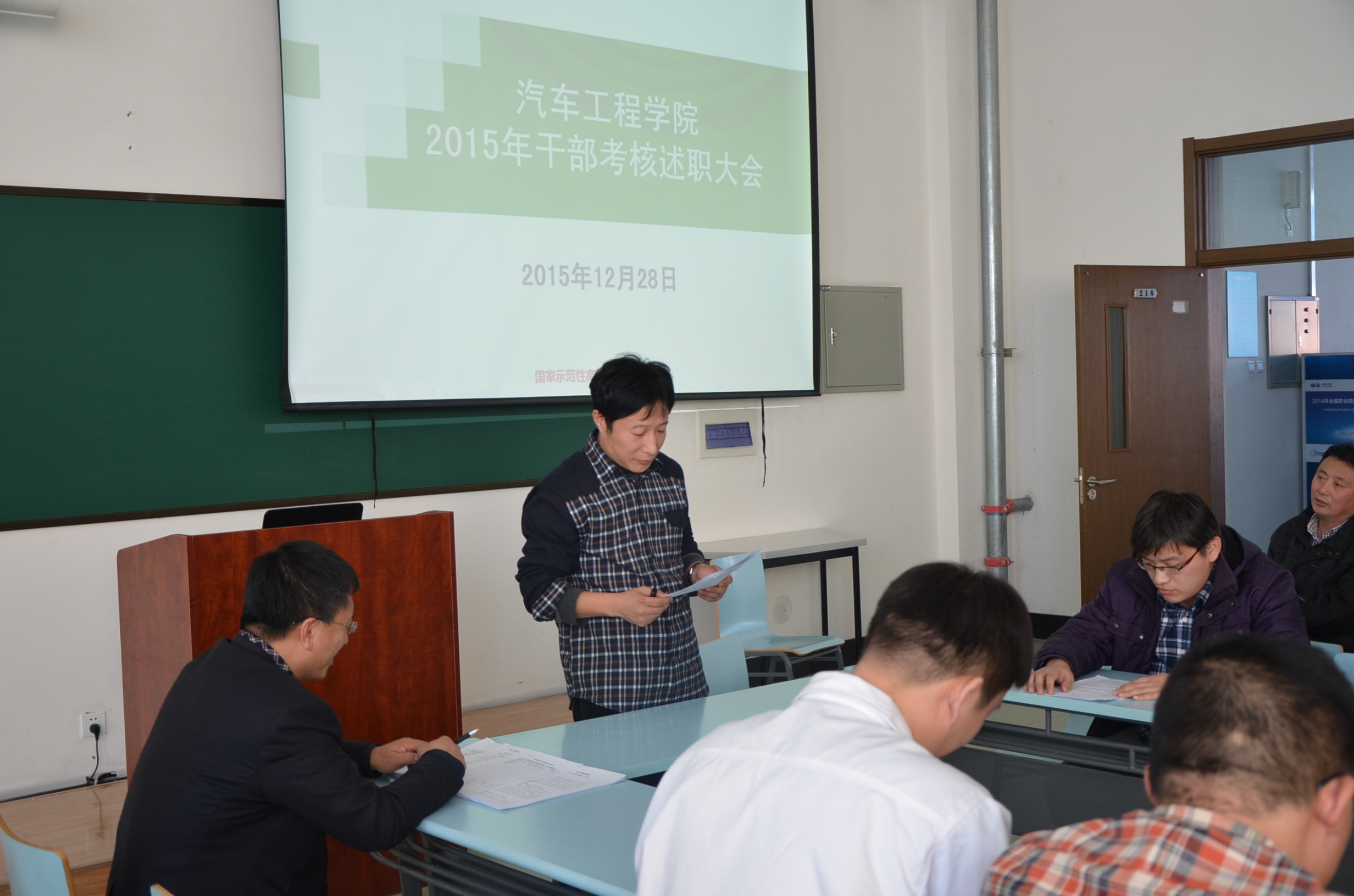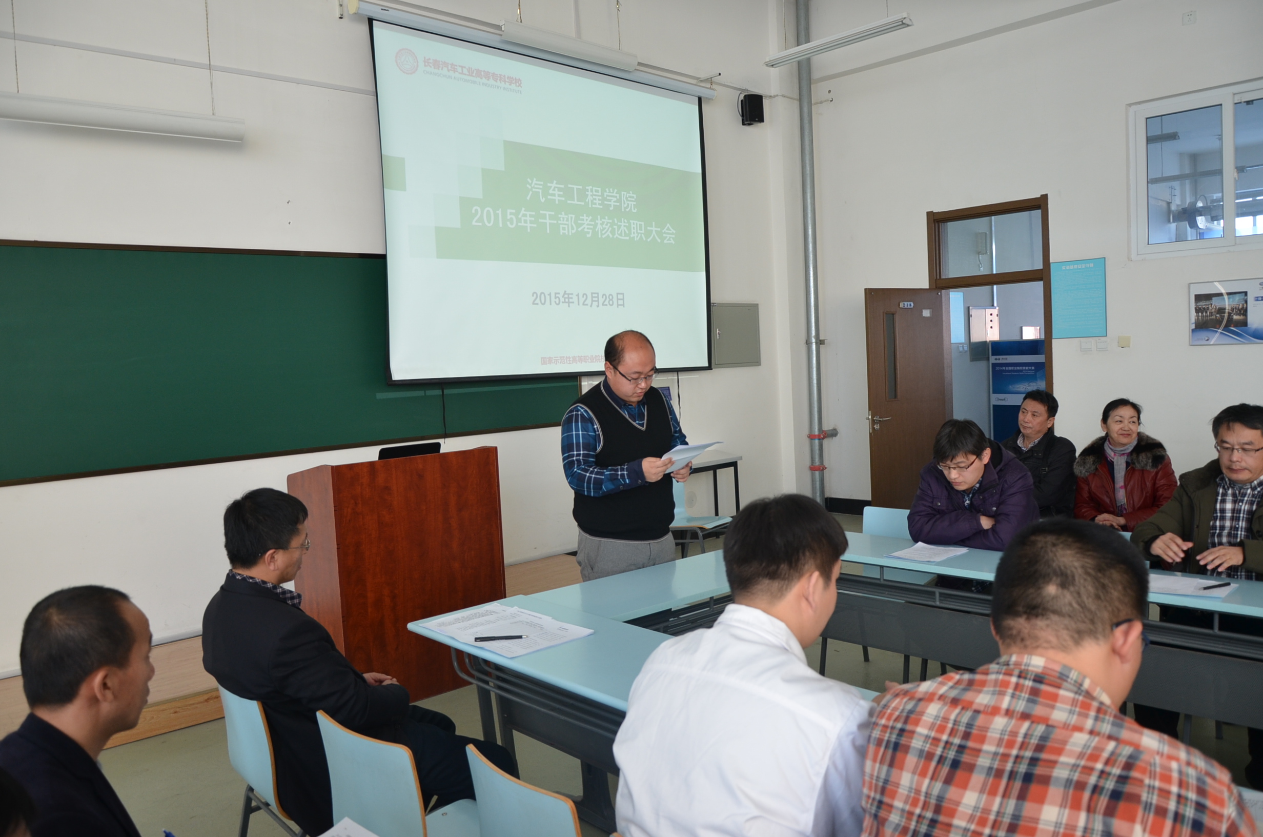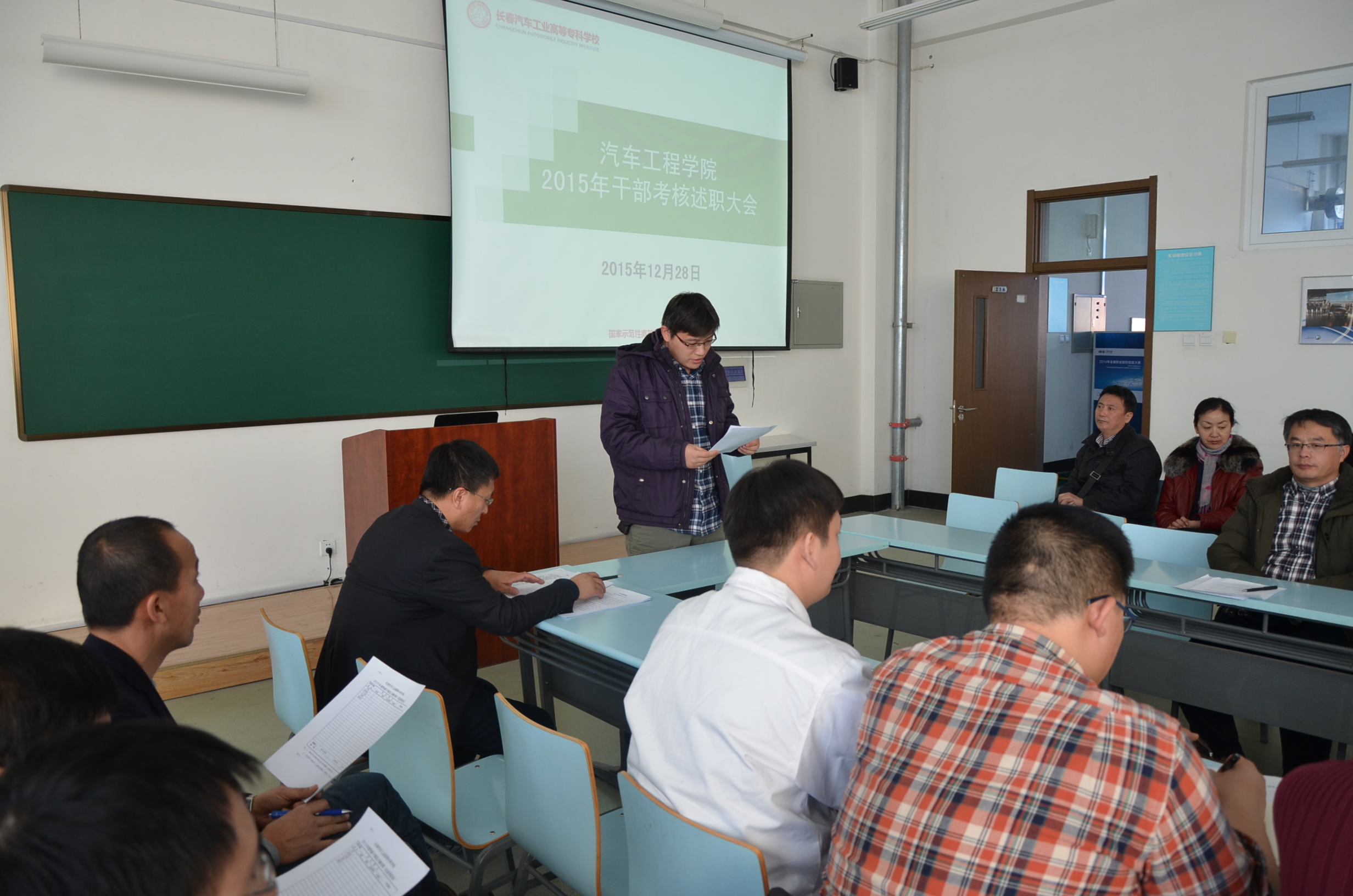 12月28日,汽车工程学院在7号楼218教室召开2015年度干部考核述职大会,校考核小组成员学校办公室主任丁卓、党委宣传部副部长蒋希娟出席了会议并对学院处级干部进行了测评,学院全体教师参加了会议。