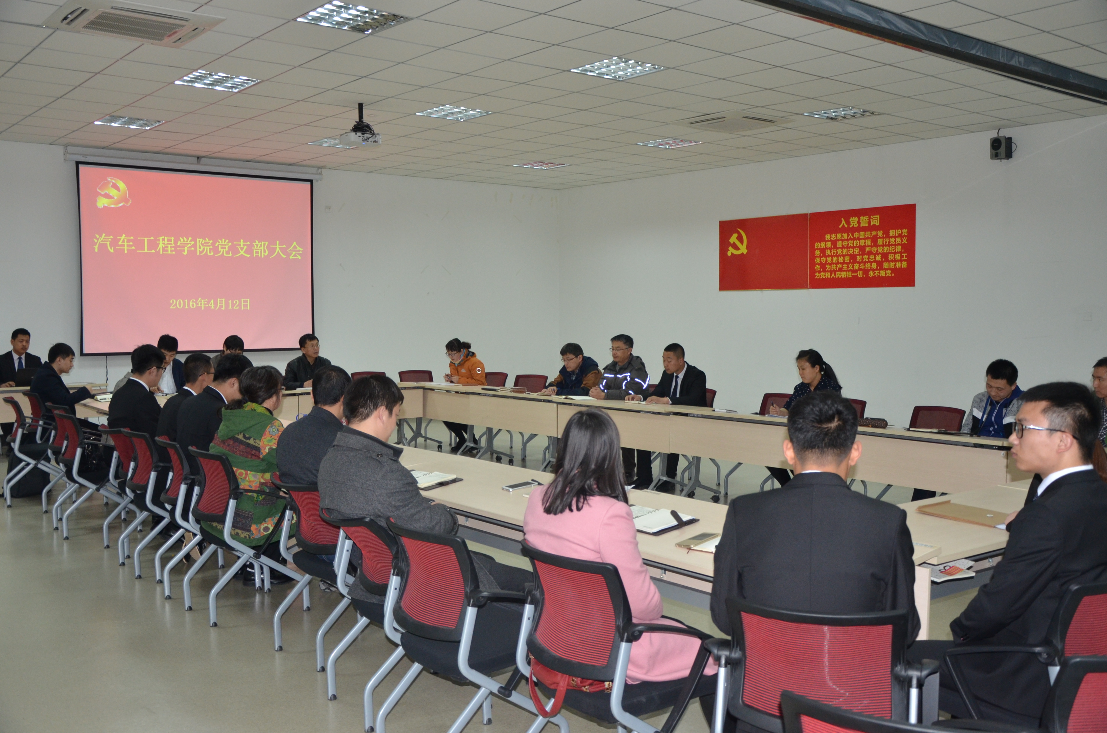 4月12日下午,汽车工程学院党支部在3号楼218室召开党支部大会,会议由支部书记赵宇同志主持,学院全体教师党员、学生党员及入党积极分子参加了会议。本次会议议程主要有三项:2013级三名预备党员进行入党宣誓;学院党支部成立三个党小组;组织2013级三名预备党员及2014级入党积极分子党章考试。