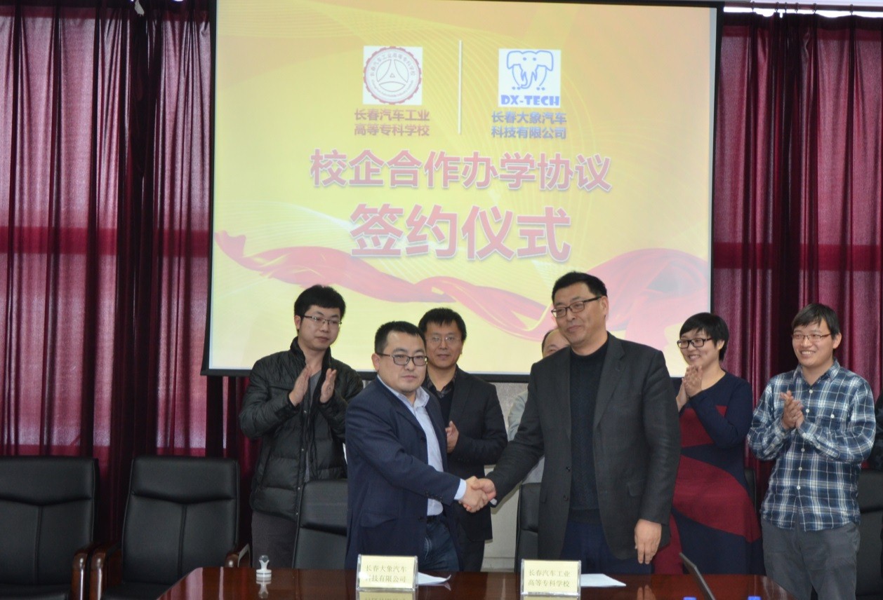 2017年3月2日,我校汽车造型技术专业与长春大象汽车科技有限公司正式建立校企合作办学关系,我校副校长胡国良与大象汽车总经理徐峰代表校企合作双方签署了合作办学协议。出席本次签约仪式的有教务处副处长陆俊松、汽车工程学院院长赵宇、汽车工程学院副院长王慧怡、大象汽车技术部经理高健鑫以及汽车造型技术教研室全体教师。
