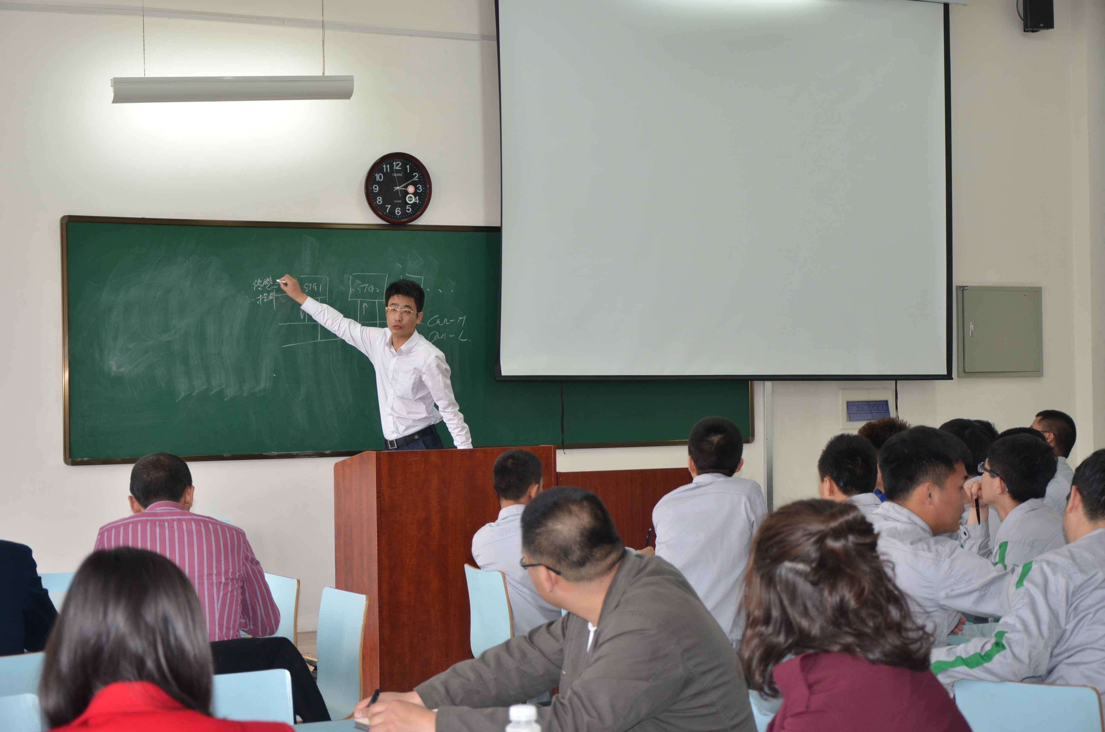 培训中刘迎辉主要针对排除车辆故障中涉及到的电路图、继电器、开关以及诊断仪的运用进行了详细的讲解。刘迎辉从实际生产现场出发,从车辆装配后可能出现的故障入手,运用诊断仪演示并讲解了针对各种故障的排除方法,为我院师生上了一堂生动的汽车专业知识课程。培训结束后,刘迎辉与工作室全体教师深入探讨了“名师带徒”学生的总体情况,为下一步将要开展的培训、讲座等系列活动打下扎实的基础。