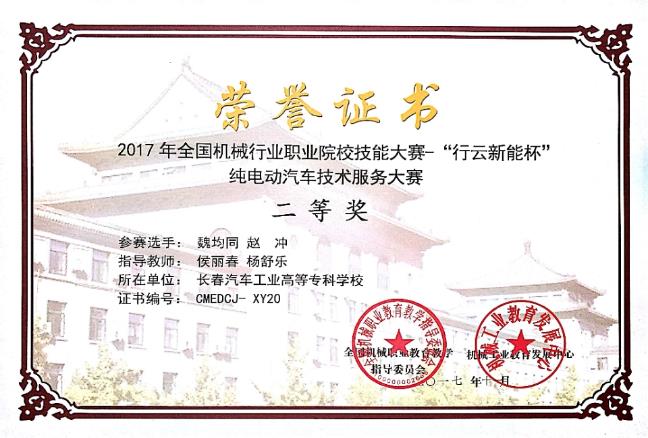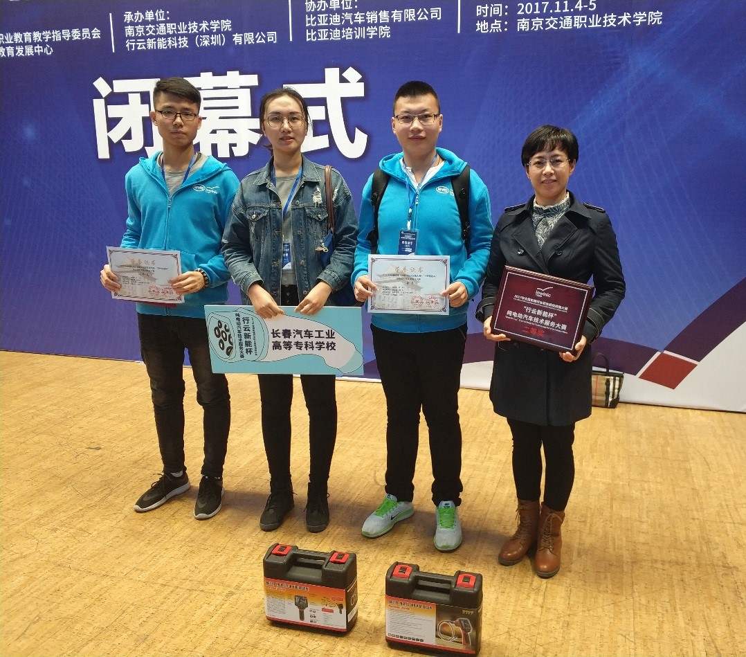 2017年全国机械行业职业院校技能大赛-“行云新能杯”纯电动汽车技术服务大赛于11月3日-6日在南京召开,我院教师侯丽春、杨舒乐,带领学生魏均同、赵冲参加高职组比赛,喜获大赛二等奖,总成绩排名第六。