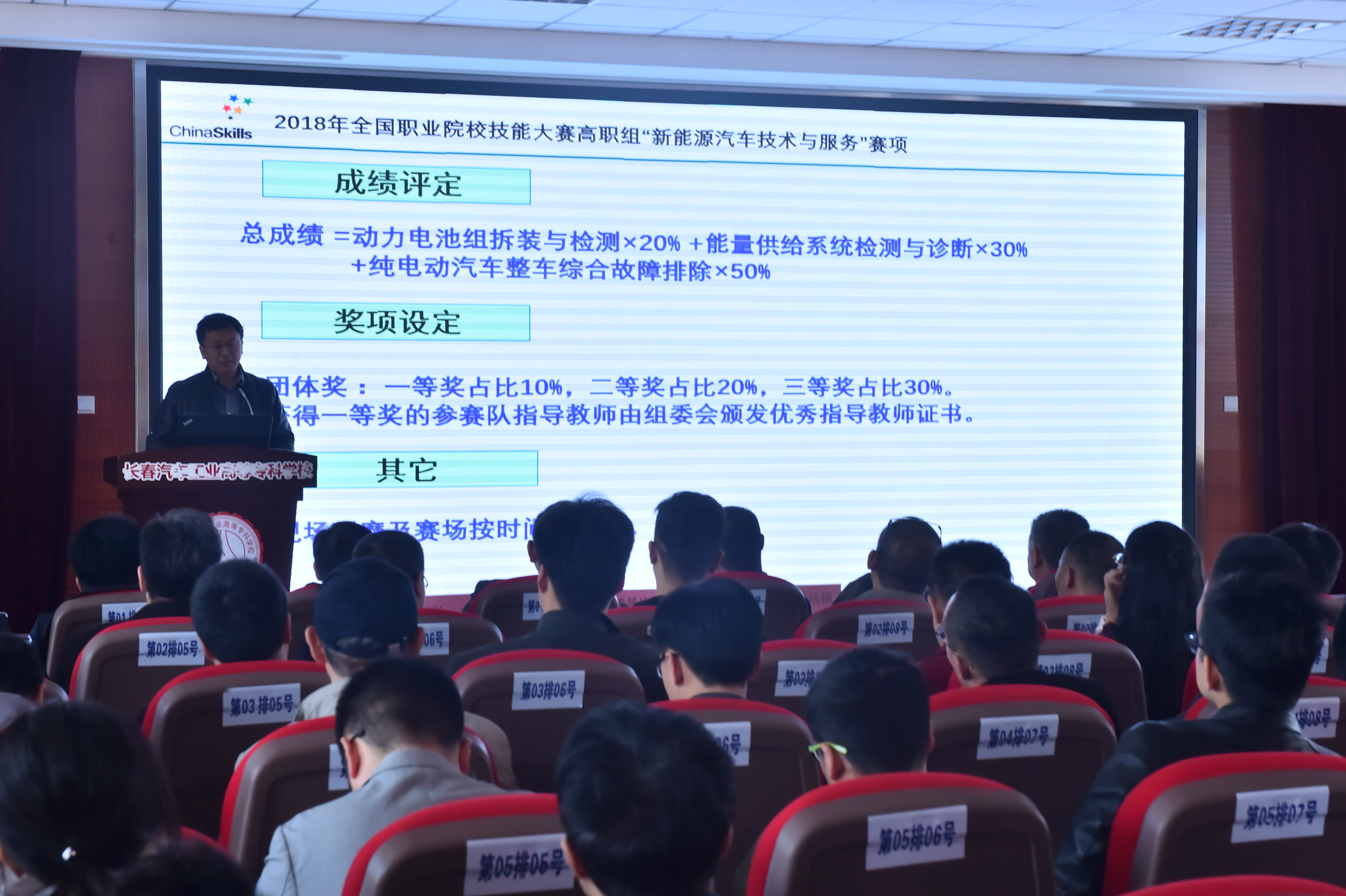根据教育部2018年全国职业院校技能大赛筹备工作的有关要求,为切实保证大赛的顺利进行,2018年4月18日全国职业院校技能大赛高职组“新能源汽车技术与应用”赛项说明会在长春汽车工业高等专科学校成功召开。参加会议人员有来自全国各地的48所高职院校领队及指导教师、赛项执委会代表、专家代表、承办院校代表及本赛项合作的企业代表,人员共计90余人。其中参会领导有机械工业教育发展中心职业教育处吕冬明副处长、长春汽车工业高等专科学校汽车工程学院赵宇院长、广东机电职业技术学院汽车学院陈黎明院长、天津职业大学汽车工程学院李晶华院长、北京卓创至诚技术有限公司董事长戴景岩行云新能科技(深圳)有限公司销售总监陈胜吉利集团新能源汽车研究院孙全部长邸玉峰等。