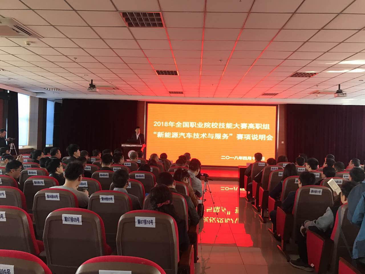 根据教育部2018年全国职业院校技能大赛筹备工作的有关要求,为切实保证大赛的顺利进行,2018年4月18日全国职业院校技能大赛高职组“新能源汽车技术与应用”赛项说明会在长春汽车工业高等专科学校成功召开。参加会议人员有来自全国各地的48所高职院校领队及指导教师、赛项执委会代表、专家代表、承办院校代表及本赛项合作的企业代表,人员共计90余人。其中参会领导有机械工业教育发展中心职业教育处吕冬明副处长、长春汽车工业高等专科学校汽车工程学院赵宇院长、广东机电职业技术学院汽车学院陈黎明院长、天津职业大学汽车工程学院李晶华院长、北京卓创至诚技术有限公司董事长戴景岩、行云新能科技(深圳)有限公司销售总监陈胜、吉利集团新能源汽车研究院孙全部长及邸玉峰等。