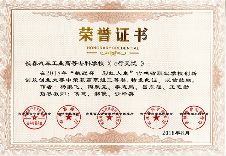 2018年11月21日,由共青团吉林省委员会、吉林省教育厅、吉林省人力资源和社会保障厅、吉林省科学技术协会、吉林省学生联合会联合主办的2018年“挑战杯——彩虹人生”吉林省职业学校创新创效创业大赛落下帷幕。我院《e行无忧》团队经过多轮比拼,最终成功杀入决赛,喜获三等奖!