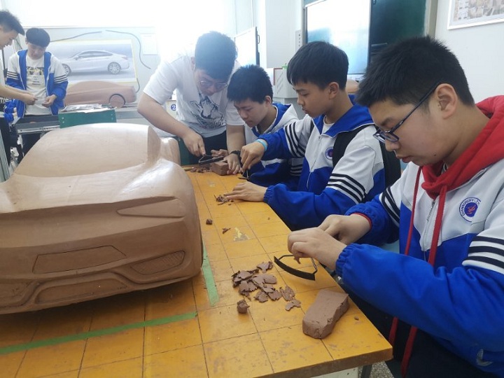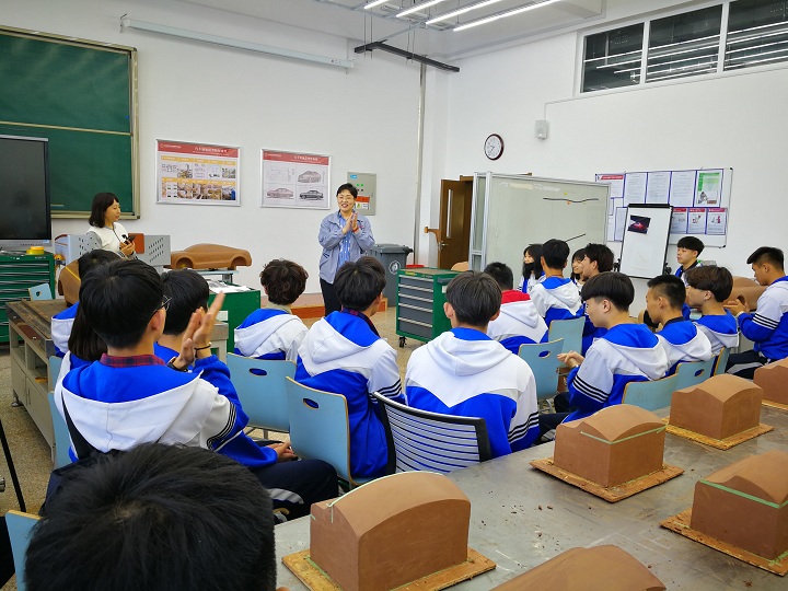 首先,由郑涛老师带领中职师生一行30人参观了学院专业实训室,随后来到汽车模型制作实训区,参观了我校汽车造型专业学生设计的模型作品。在此过程中,郑涛老师向来访师生介绍了造型专业的办学特色,人才培养方式以及未来专业发展方向等,并对学生未来从事的职业岗位做了详细说明。