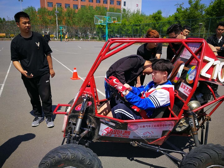 在学生们参观“巴哈”车队时,大家对车队的赛车产生了浓厚的兴趣,还进行了试乘试驾项目,让前来参观的同学们体验了一次驾驶赛车的感觉。