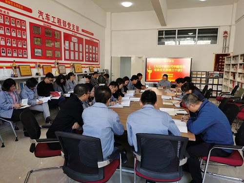 2019年10月16日9:40,汽车工程部党支部全体党员在2018—2019学年度校“优秀共产党员”获得者李文娜同志的领学带领下,集中学习了«习近平新时代中国特色社会主义思想三十讲»的前五讲之相关内容。