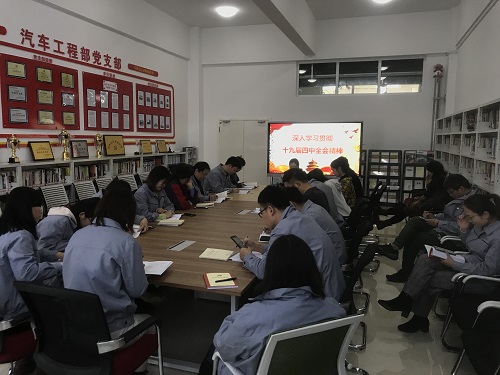 2019年11月26日9点40分,汽车工程部党支部由付雯琳同志领学,全体党员深入学习贯彻习近平总书记在党的十九届四中全会上的讲话精神的相关内容。
