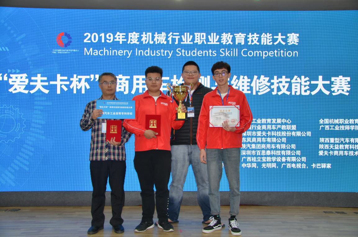 2019年12月1日,在美丽富饶的“中国绿城”广西南宁,2019年度机械行业职业教育技能大赛“爱夫卡杯”商用车检测与维修技能大赛刚刚落下帷幕,汽车工程学院汽车试验技术专业教师赵晓宛、陈子谋指导的学生郭晋儒,在柴油机电控系统故障诊断和喷油器检测两个科目合计获得大赛中最高分90分,取得了大赛第一名,丁鹏同学获得了三等奖的好成绩。