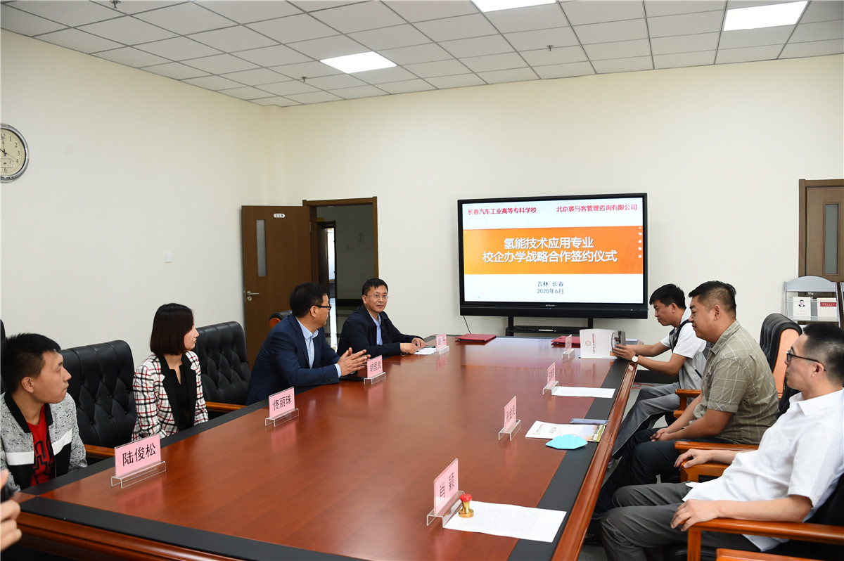 6月3日,长春汽车工业高等专科学校与北京裘马客管理咨询有限公司,就氢能技术应用专业校企办学战略合作进行签约,签约仪式在图书馆518会议室举行。北京裘马客管理咨询有限公司总经理王默淳,长春分公司总经理 郑险峰,长汽高专副校长胡国良,汽车工程学院院长赵宇出席签约仪式。仪式由赵宇院长主持,胡国良副校长在签约仪式上表示,氢能源产业发展是划时代的能源发展,氢能源产业的人才培养对国家经济建设和社会发展有着重大作用。作为职业人才培养的摇篮,长汽高专将与北京裘马客公司展开全面优质办学合作,整合双方优势资源,共同培养现代化前瞻性产业专业型实用人才。双方将建立产、教、研、用深度融合的长期战略合作关系,集中优势教育力量,发挥专业特色,深化产教融合,助力学校特高建设。王默淳总经理表示,此次与长春汽车工业高等专科学校的深度合作,能为全国氢能企业定向培养输送高素质技术技能人才,帮助企业构建良好的人才资源结构,企业也会为学生提供更好的发展机遇和提升平台。公司将与校方共同把氢能应用技术专业建设成为集人才培养、技术应用研发、社会服务于一体的特色产业专业,推动企业、行业的高质量发展。