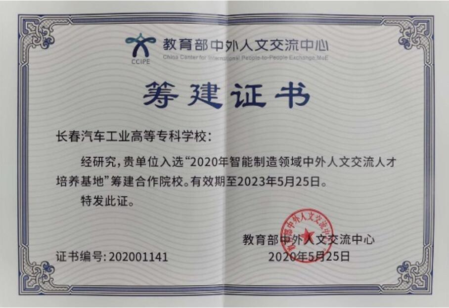 2020年5月,我校入选由教育部中外人文交流中心组织评选的“智能制造领域中外人文交流人才培养基地项目”。该项目主要由学校国际学院和汽车工程学院承办,项目建设重点包含:智能网联新能源汽车实训基地建设,“车路协同”产学研实训基地建设,车用氢能应用技术实训基地建设,以新能源汽车零部件标定、试制、试验等生产性项目为载体,探索股份制实训基地建设模式,实现校企共建、共享、共赢,带动和提升我校国际化服务能力和水平。