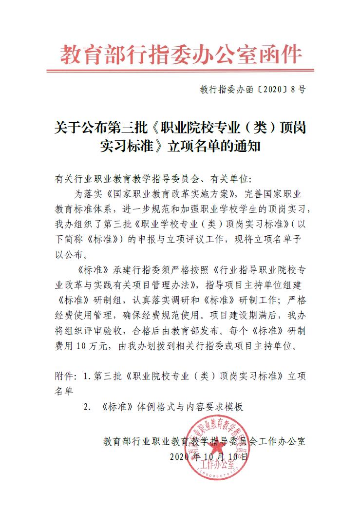 为 落实《国家职业教育改革实施方案》,完善国家职业教育标准体系进一步规范和加强职业学校学生的顶岗实习,教育部行业职业教育教学指导委员会工作办公室组织了第三批《职业学校专业(类)顶岗实习标准》的申报与立项评议工作,我院院长赵宇牵头,组建校企项目工作团队,积极申报新能源汽车技术专业顶岗实习标准立项工作,2020年10月10日教育部行业职业教育教学指导委员会工作办公室发文“关于公布第三批《 职业院校专业 (类 顶岗实习标准 》立项名单的通知”,我院负责申报项目顺利通过评审,下一步将组织人力资源,高标准编写新能源汽车技术专业顶岗实习标准,进一步规范新能源汽车技术专业顶岗实习管理。