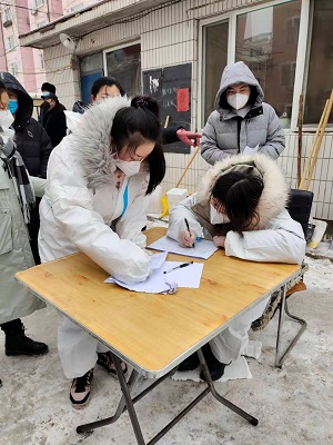 图五 2020级学生杨雯裕(左一),在长春市九台区国税家属楼院宣传核酸检测流程