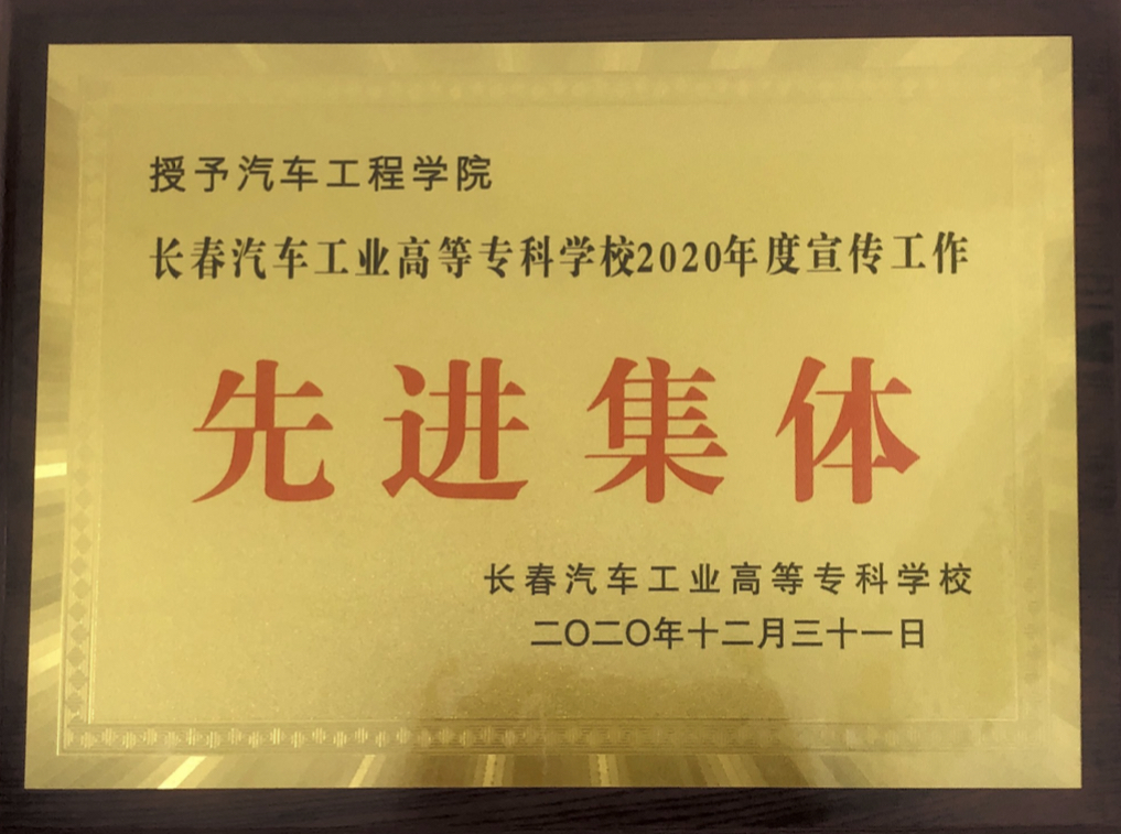 近日学校对2020年度新闻宣传工作进行了表彰,我院荣获“长春汽车工业高等专科学校2020年度宣传工作先进集体”称号。