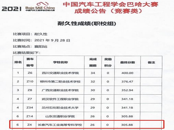 图6 油巴哈赛车获得2021巴哈赛车耐久赛职校组全国第六名