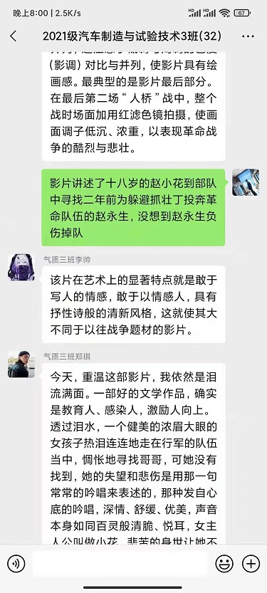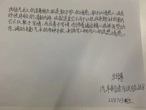 影片结束后,师生纷纷表示,通过新旧中国的对比,能够更深刻感受此刻安定富裕的生活来之不易,在当今的和平年代,我们更要铭记历史、缅怀先烈,克服骄娇二气,我们要坚定理想信念,时刻牢记并弘扬“革命理想大于天”的崇高精神,走好“新时代长征路”,主动响应时代的号召,埋头苦干,为学校的发展贡献力量,为实现中华民族伟大复兴而努力奋斗。