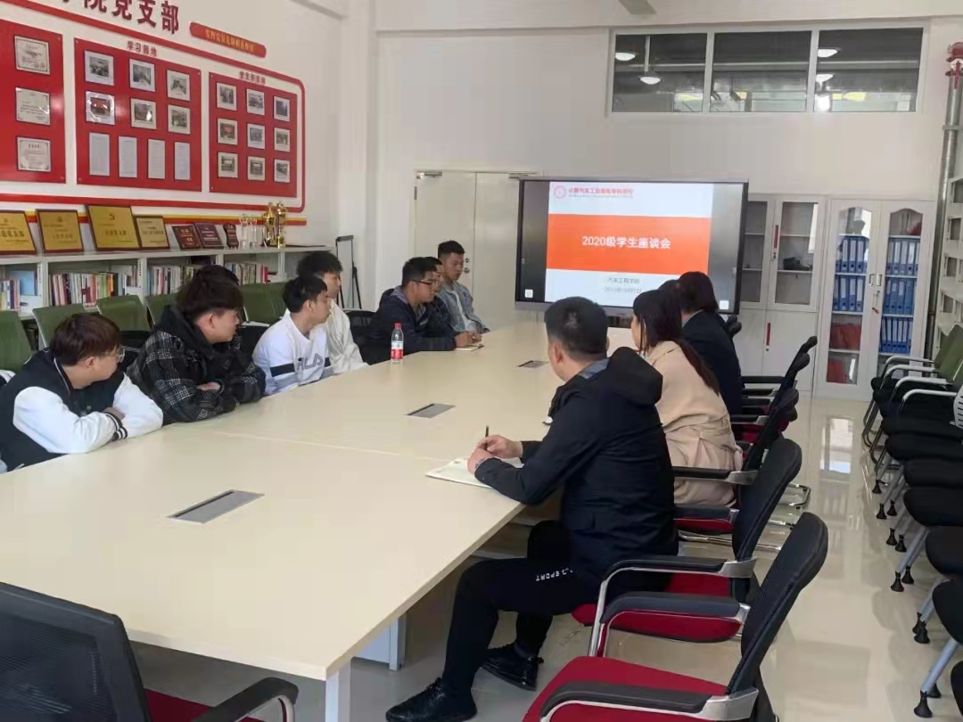 为全面了解和掌握教学运行与管理情况,了解本学期开学以来同学们的学习生活状况,加强师生交流,2021年10月7日下午,汽车工程学院开展了2020级师生座谈交流会活动,会议由团总支书记杨宇主持,汽车工程学院院长赵宇、2020级辅导员以及2020级10名同学参加了本次活动。