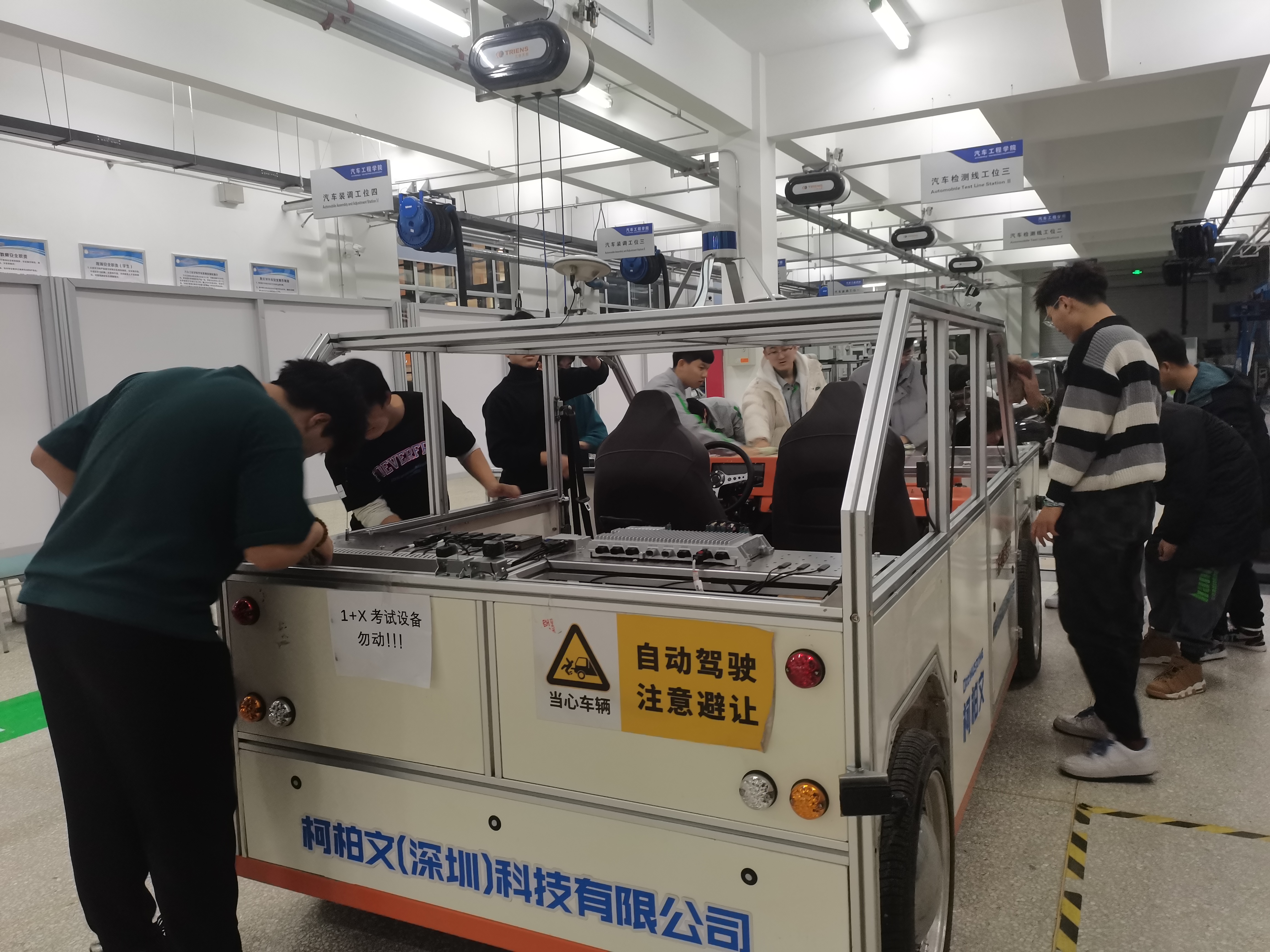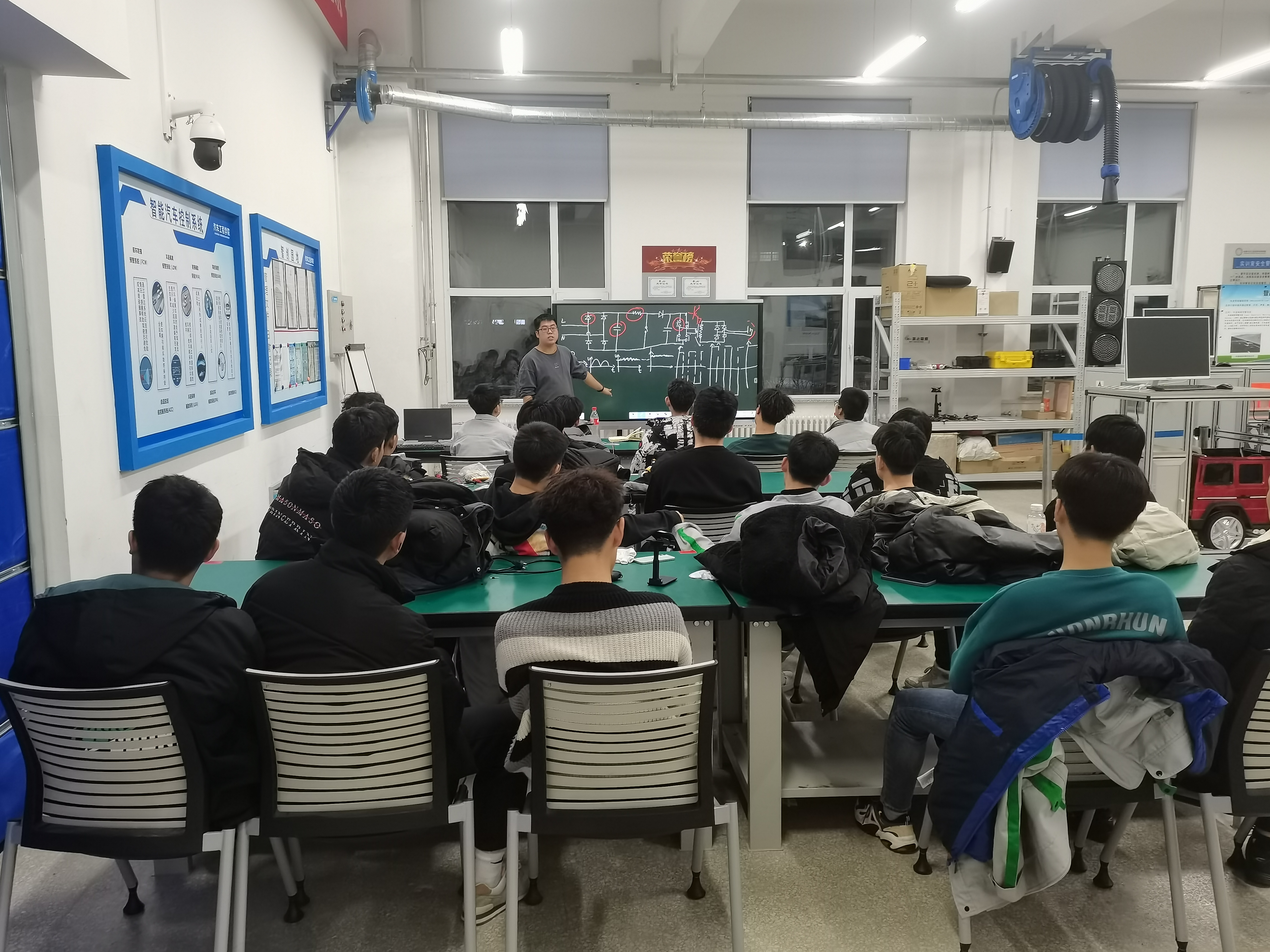 在社团成员清洁完实训区的卫生后,大二学长发现同学们对新到的1+X智能网联汽车测试装调设备充满兴趣,于是借此机会,为社团成员讲解智能汽车控制技术、智能汽车控制系统、各类传感器的原理及新能源汽车基础知识。
