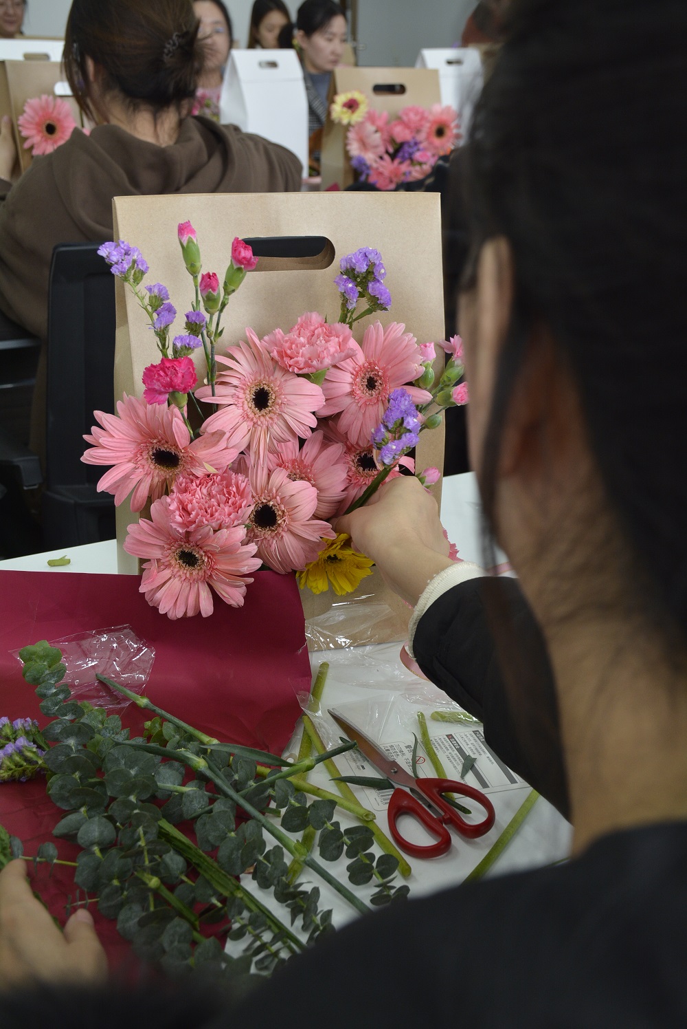 讲座中,老师从插花艺术特点、插花发展史讲起,并对插花艺术和技巧,对花卉的品种、特性、花语及不同的插花手法、花卉色彩搭配等基本技巧做了说明,女职工在花艺老师的指导下亲自动手尝试修剪枝叶、搭配色彩,制作插花作品。在边讲边教边示范的过程中,大家不仅了解了中华传统花艺的造型特色、传统文化意蕴及美学鉴赏等方面的基本知识,大家还创作出了一篮篮春意盎然、婉约雅致的插花作品。