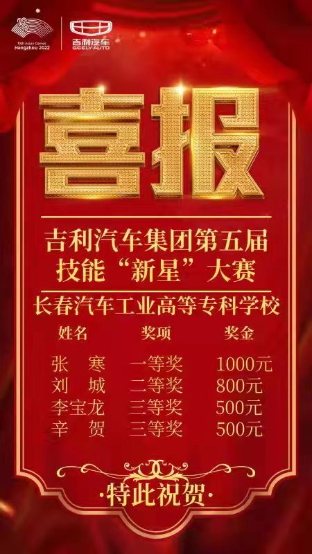 星光不负赶路人,近日,在吉利汽车集团举办的第五届技能“新星”大赛中,我校汽车工程学院新能源汽车技术专业张寒同学荣获一等奖、李宝龙同学荣获三等奖。
