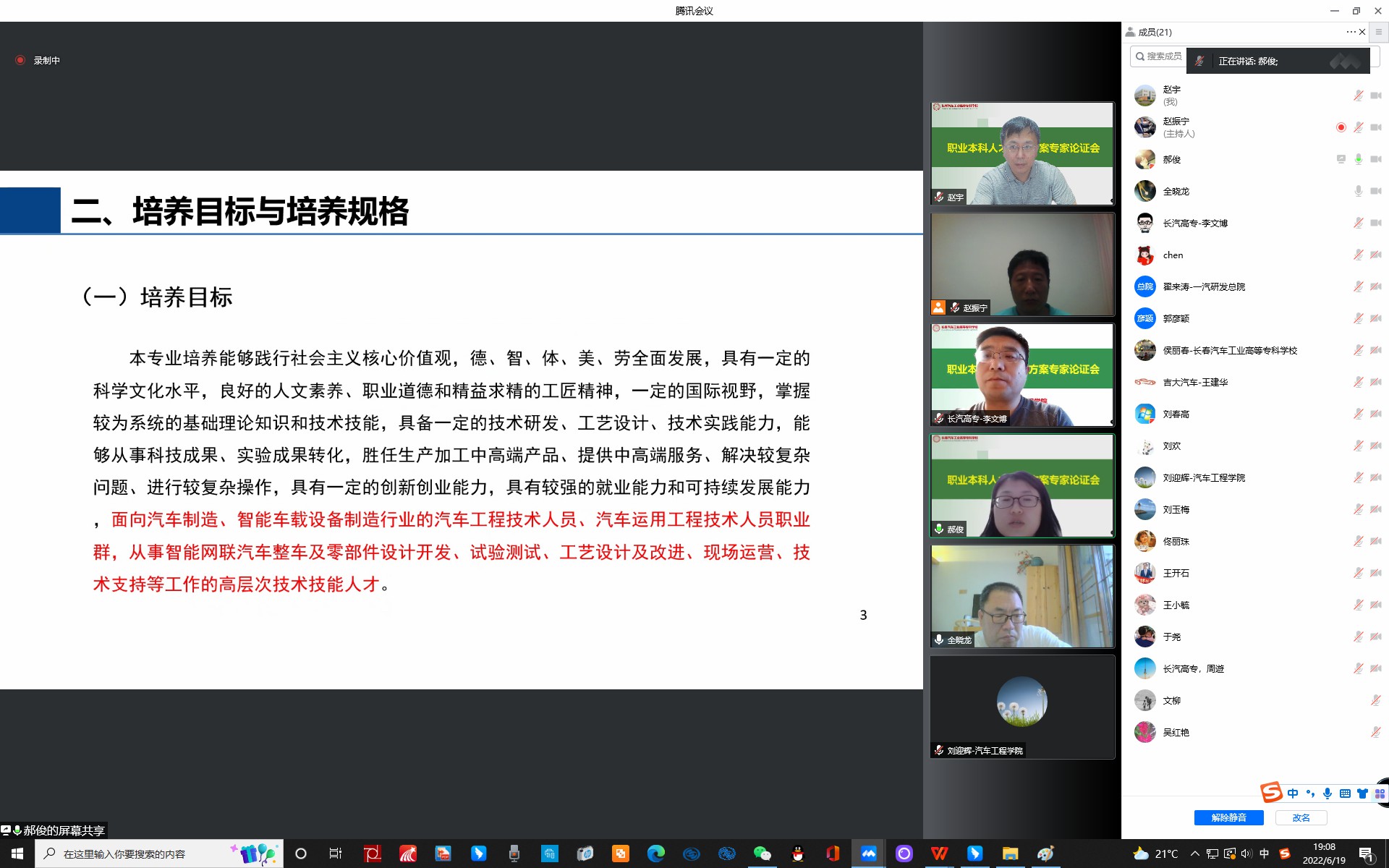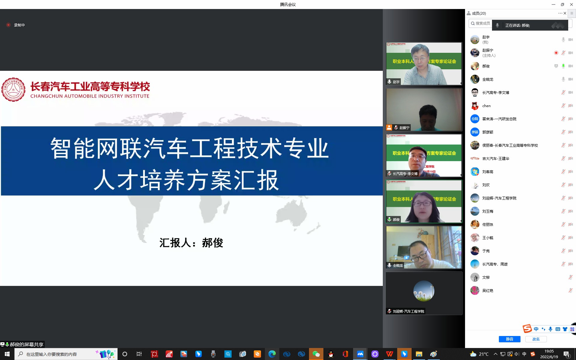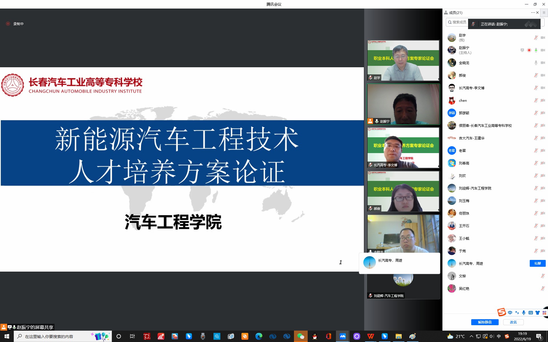 2022年6月19日星期日,汽车工程学院院长赵宇,副院长李文博,新能源汽车技术专业主任赵振宁,汽车智能技术专业主任郝俊,吉林大学专家刘玉梅和王建华,大连奥迪培训中心技术总监全晓龙,一汽研发总院的高级工程师翟来涛,一汽红旗工艺部的刘春高等人,通过线上会议形式对所建职业本科新能源汽车公车技术专业和智能网联汽车工程技术专业展开线上人才培养方案论证研讨会。