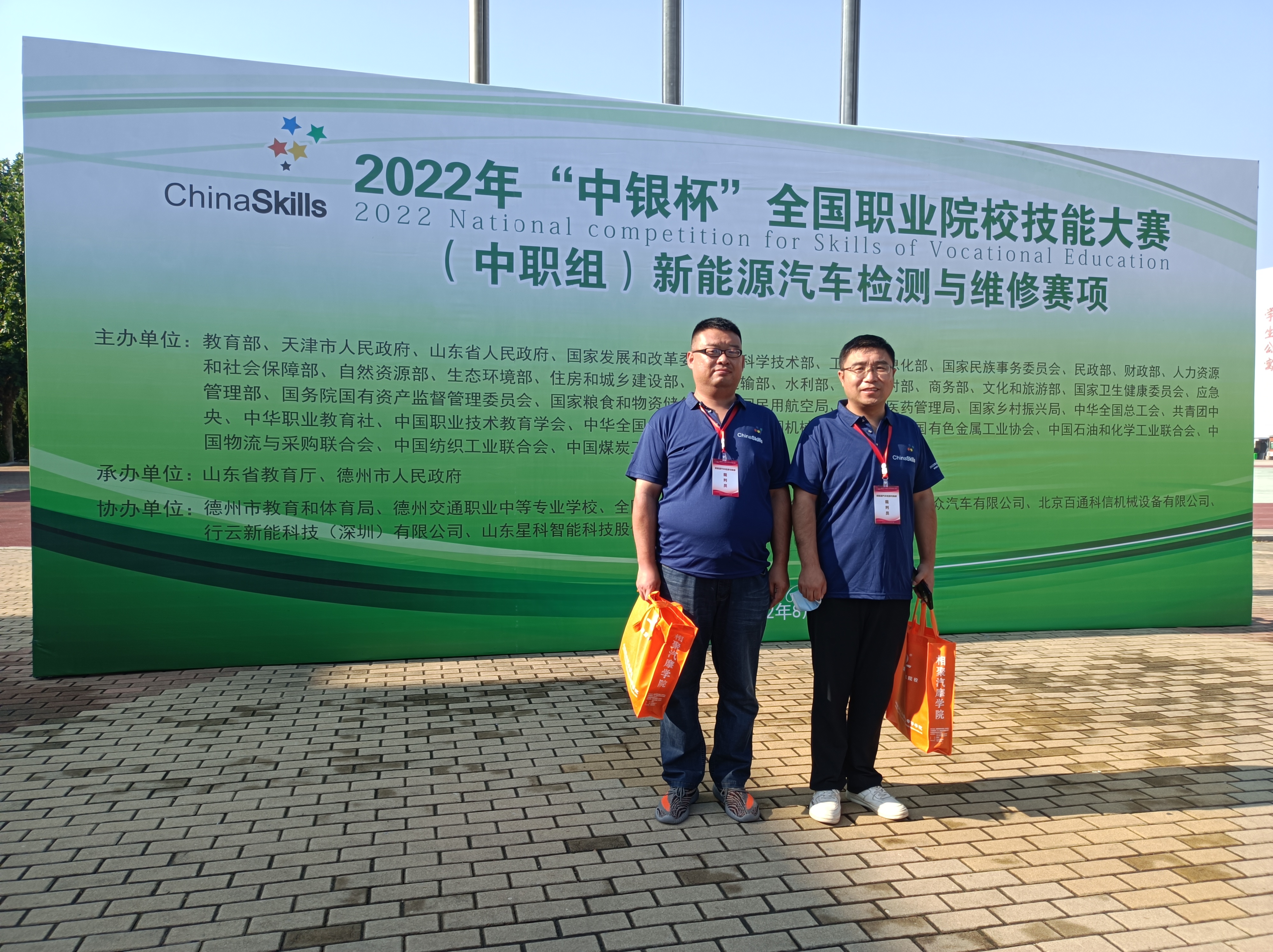 2022年8月16日—21日,2022年全国职业院校技能大赛中职组“新能源汽车检测与维修”赛项在德州交通职业中等专业学校成功举办,全国共有62支代表队参加比赛。我校汽车工程学院李文博和沙泽英两位老师受邀参加本赛项裁判工作。