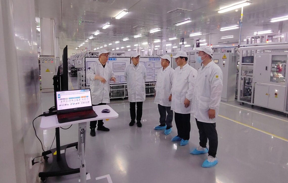 调研组一行首先在陈延军总监、沙金部长、李建凤主任的陪同下,深入企业生产一线与研发核心区域考察。在红旗车型逆变器生产及质量检测车间,沙金部长详细介绍了“精密加工-装配-检测-包装”全流程生产工艺,并重点说明数字化系统的贯通应用——通过MES系统实时监控设备状态、工艺参数及质量数据,实现生产过程“可视化、可追溯、可优化”。值得关注的是,车间内多名长汽大学实习学生正参与“装调操作”“在线检测”等岗位实践。沙金部长表示:“学生动手能力较强,能快速掌握组装工艺,但对质量管控标准的理解仍需深化,建议加强生产场景下的质量意识培养。”