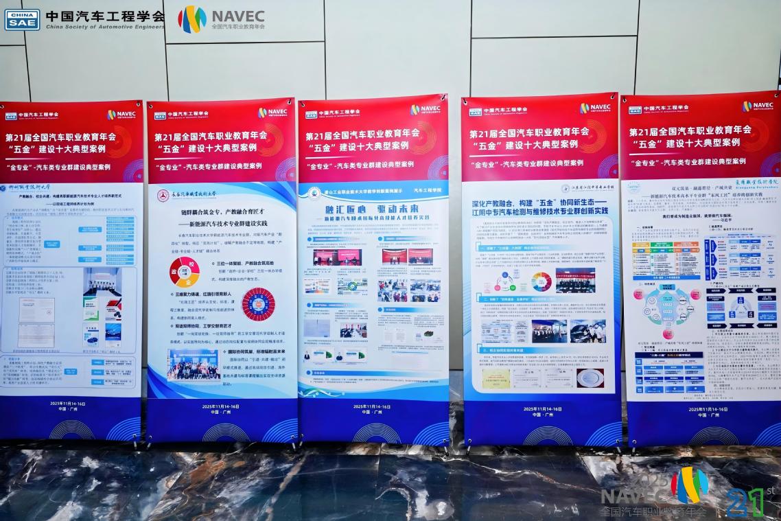 本次年会同期举办的汽车职业教育“办学能力高水平,产教融合高质量”成果展,我校携“新双高”建设成果与4项2025年度汽车职业教育“五金”建设典型获奖案例精彩亮相。