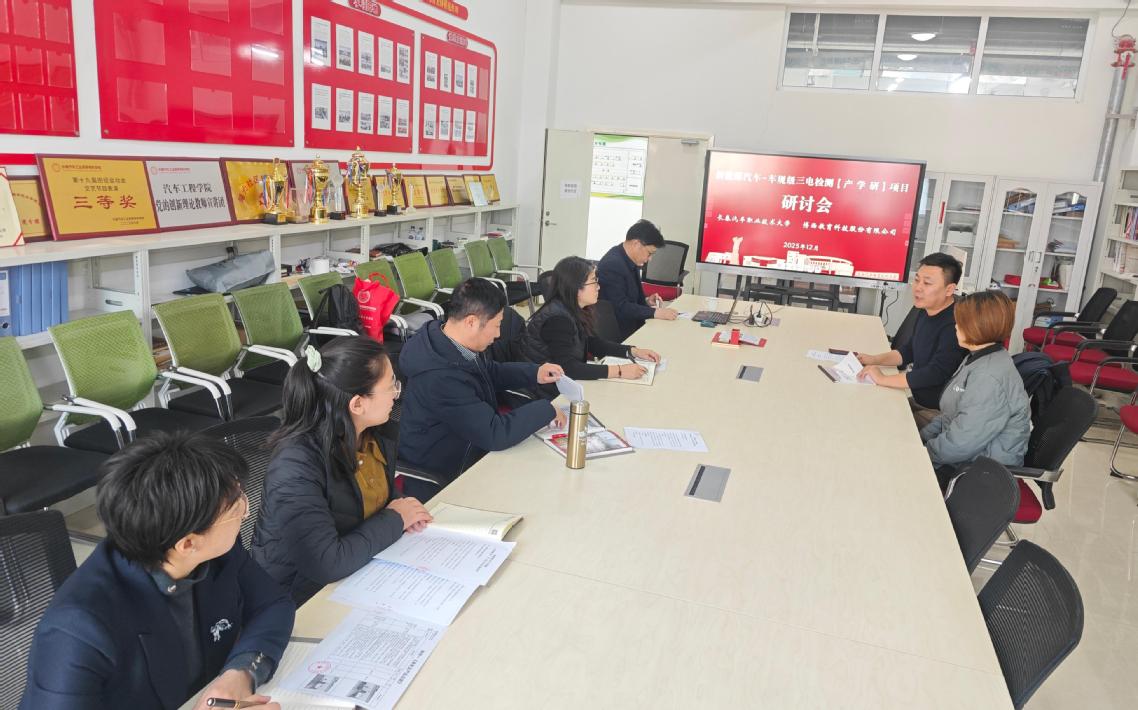 2025年12月5日,长春汽车职业技术大学汽车工程学院与博西教育科技股份有限公司于学院318展开“新能源汽车车规级三电检测”产学研项目研讨。汽车工程学院院长李东兵、副院长郝俊及骨干教师赵振宁等,与博西教育孟令伍经理一行齐聚,深化合作共识。