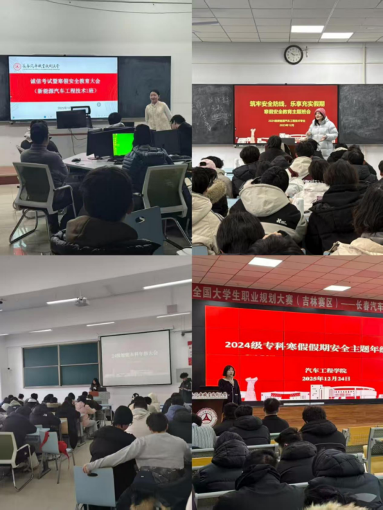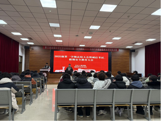 霜风渐紧,学期将暮。为让学院全体学生积极备考、文明离校,度过一个安全且有意义的假期,2025年12月22日至26日,汽车工程学院各年级开展2025-2026学年第一学期期末年级总结大会暨诚信应考、寒假安全教育大会,大会围绕学期总结、诚信考试、文明离校、假期安全四大主题展开。
